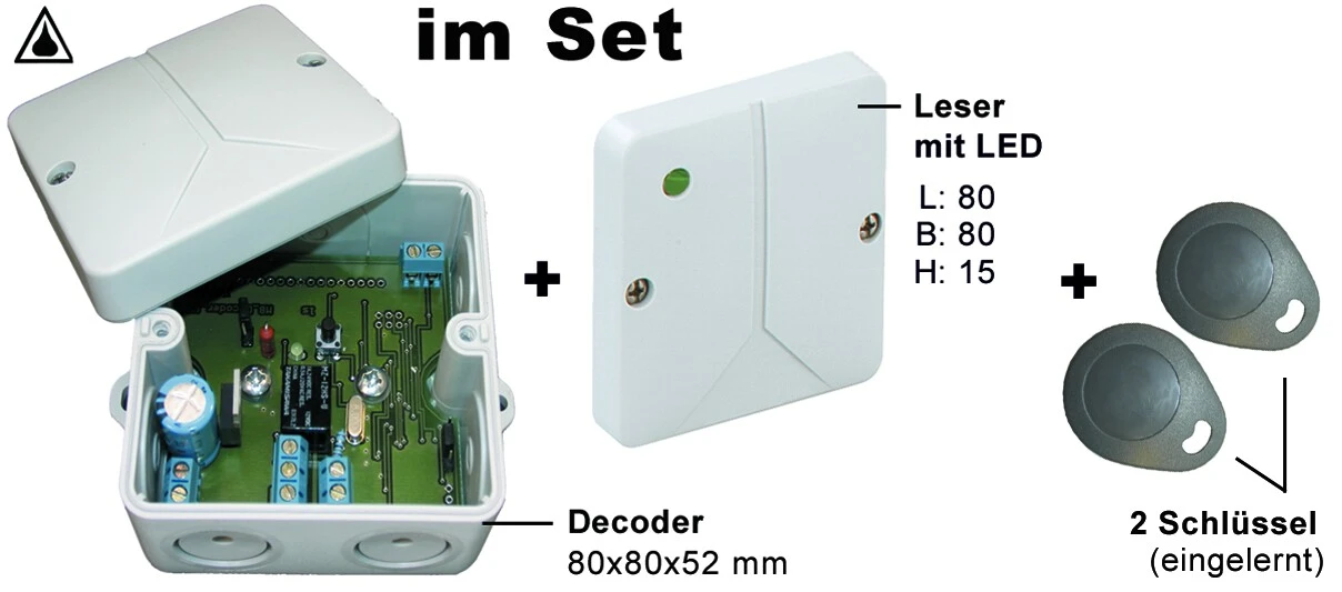 Leistungsaufnahme: 40 mA im Ruhestrom-Betrieb, 80 mA im Schaltbetrieb Schutzgrad: Decoder und Leser, wassergeschützt - IP 65