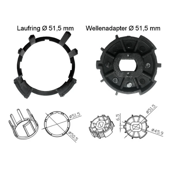 WTS - Adapterset DM-A54R : 54 mm Rundwelle mit Nut für alle Rohrmotoren Ø 45 mm, Serie DM / DMF / ME / DMEF / DMH