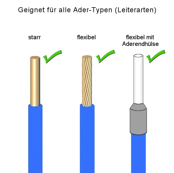 • Für alle Leiterarten: ein-, fein- oder mehrdrähtig bzw. starr/flexibel