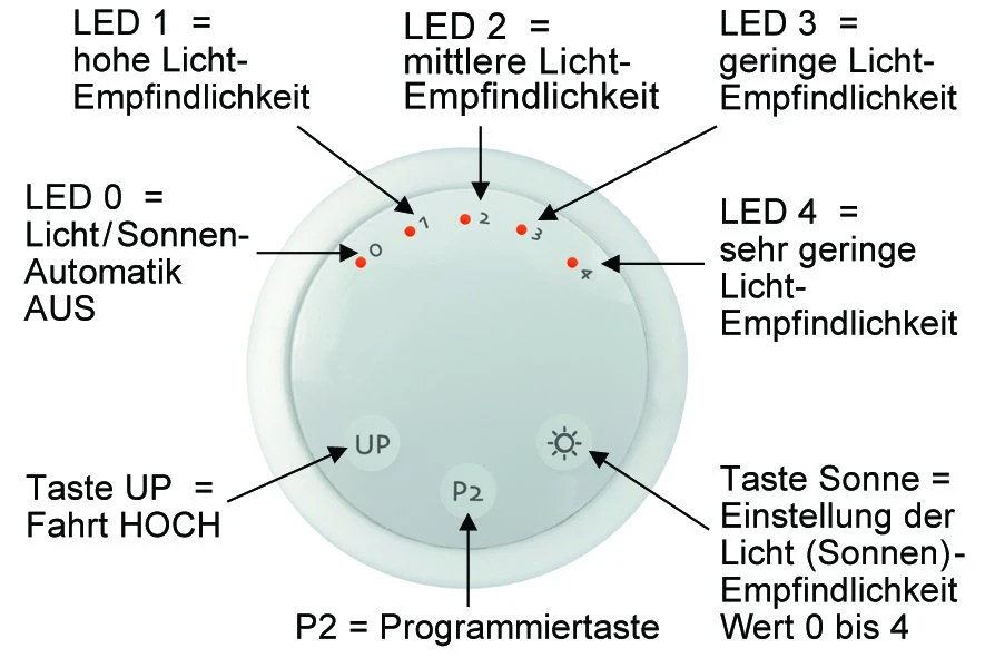 ausgestellt werden. Mit der UP-Taste am Sonnensensor ist zusätzlich jederzeit eine manuelle Auffahrt der eingelernten Motoren möglich.