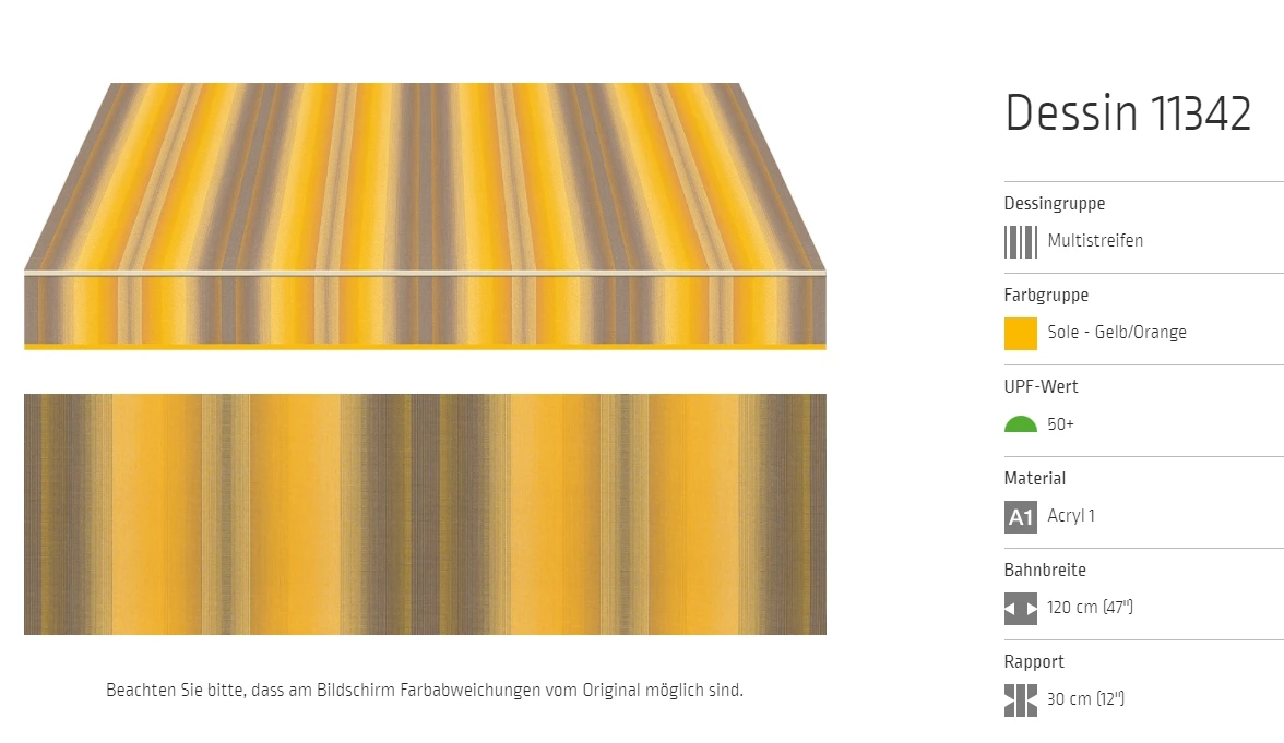 Bei allen Markisenstoffen können Unregelmäßigkeiten in der Oberflächenbeschaffenheit auftreten.