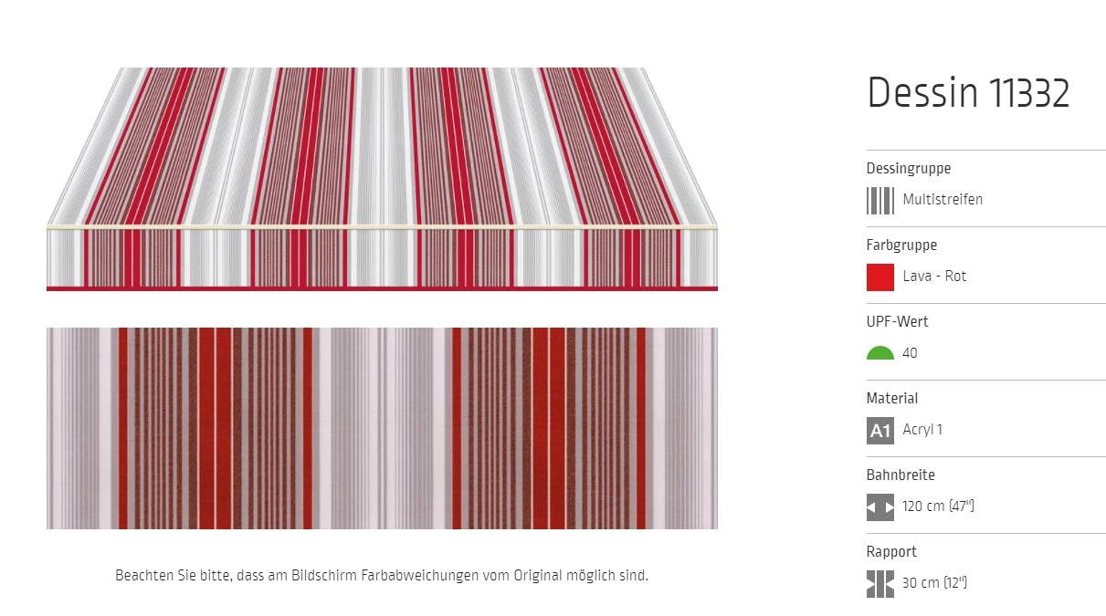 Bei allen Markisenstoffen können Unregelmäßigkeiten in der Oberflächenbeschaffenheit auftreten.