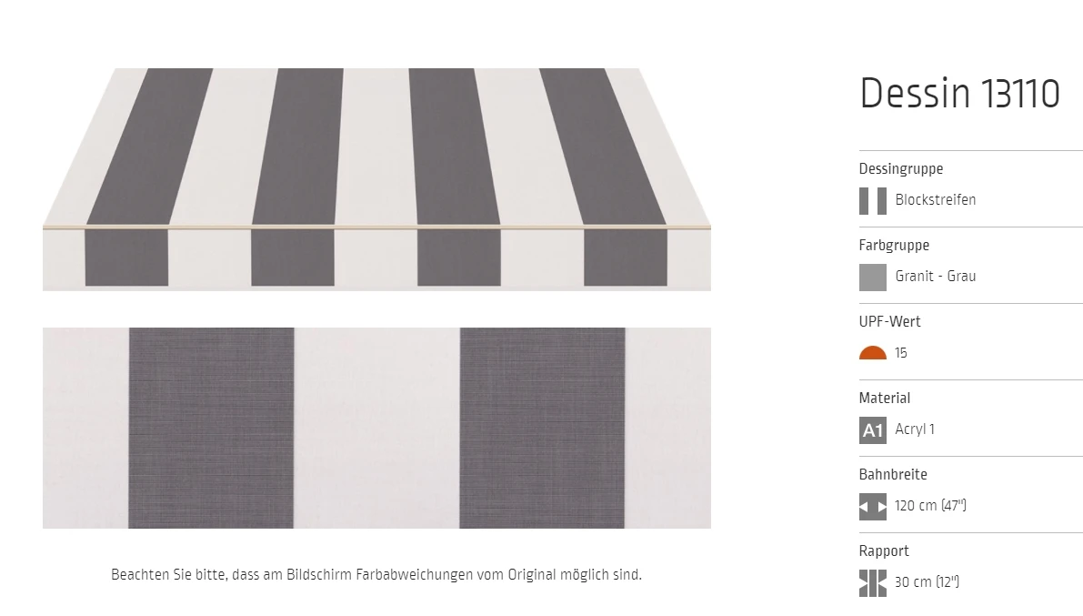 Bei allen Markisenstoffen können Unregelmäßigkeiten in der Oberflächenbeschaffenheit auftreten.