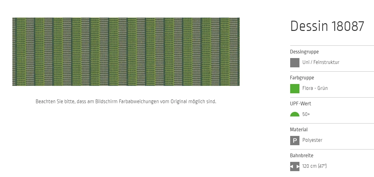 Bei allen Markisenstoffen können Unregelmäßigkeiten in der Oberflächenbeschaffenheit auftreten.