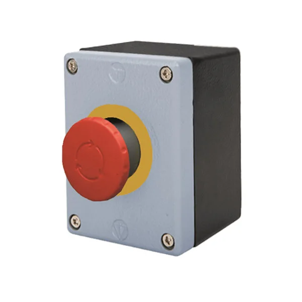 WTS - Einfach-Drucktaster aus Metall Aufputz mit rotem NOT-AUS Pilz rastend und wassergeschützt IP 65